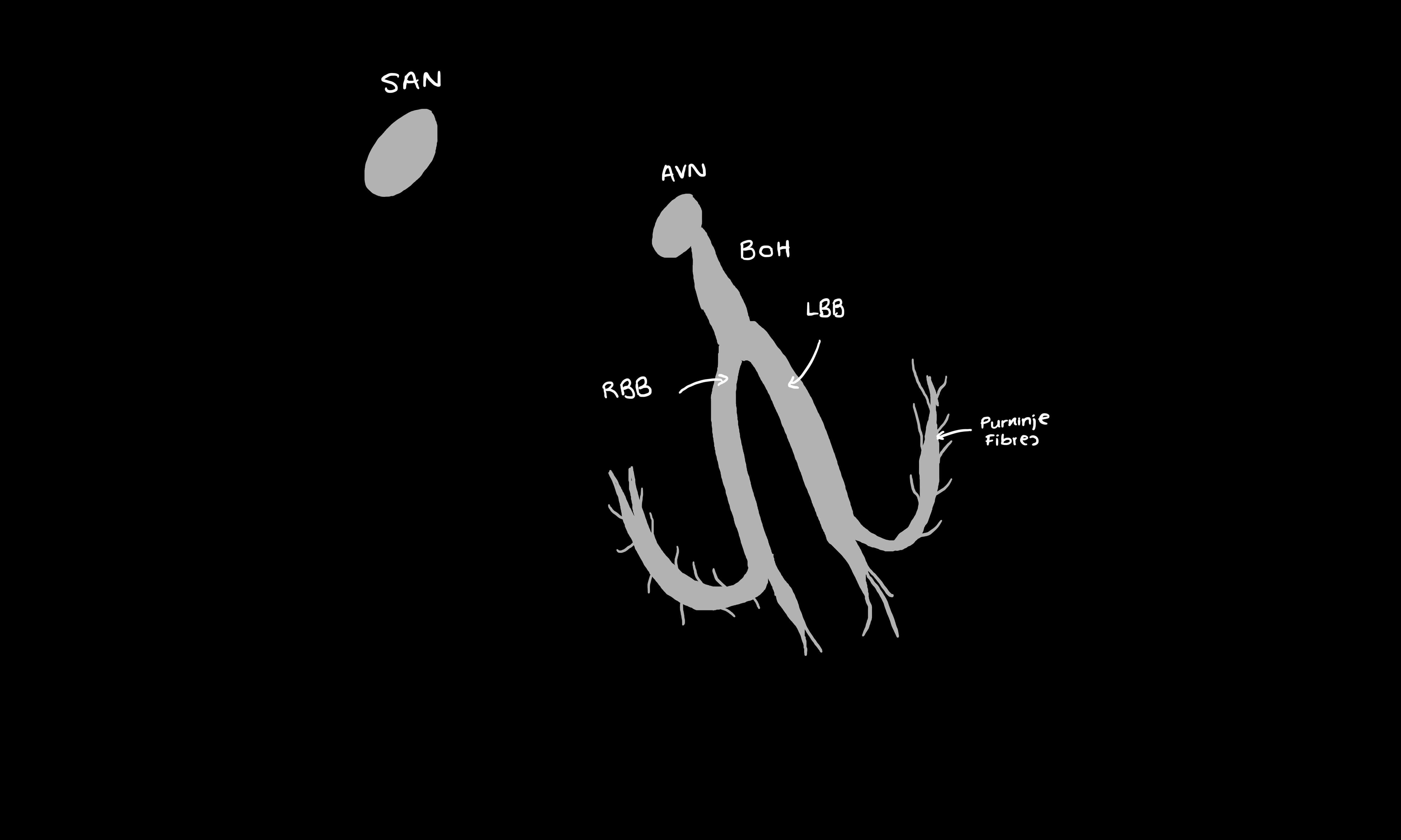 In third degree heart block, no SAN depolarisations conduct through to the ventricles, and the ventricles are relying on an ‘escape rhythm’ i.e. rhythm which is not arising from the SAN. Usually, this rhythm is generated by the AVN, bundle of His or Purkinje fibres and beats slower than the atria.