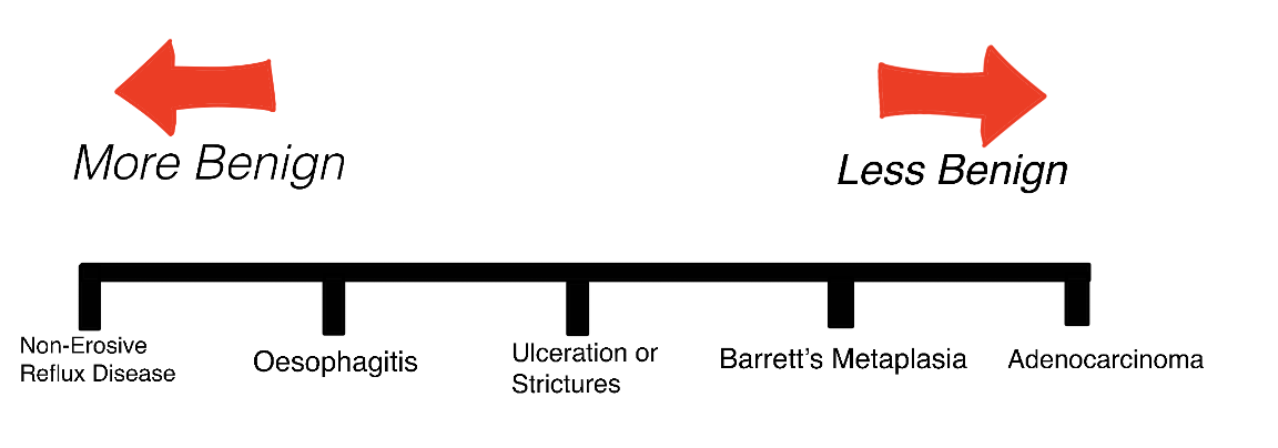 - A spectrum of disease exists in GORD, whereby some patients have non-erosive reflux disease i.e. they are symptomatic, but an upper gastrointestinal endoscopy would be negative. Some patients may develop oesophagitis which would be seen on endoscopy as a clearly inflamed and irritated oesophageal mucosa. This may progress into ulceration of the mucosa, oesophageal strictures or Barrett’s metaplasia.