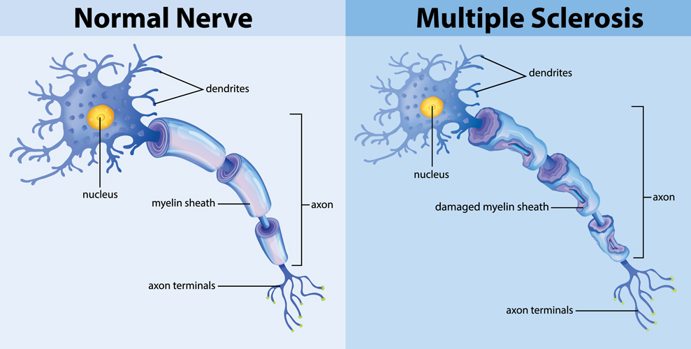 Multiple sclerosis (MS) is an autoimmune disease characterised by the destruction of the myelin sheath which surrounds nerves. It is a chronic disease though patients may experience periods of remission as well as flare-ups, the latter of which manifests with neurological symptoms.