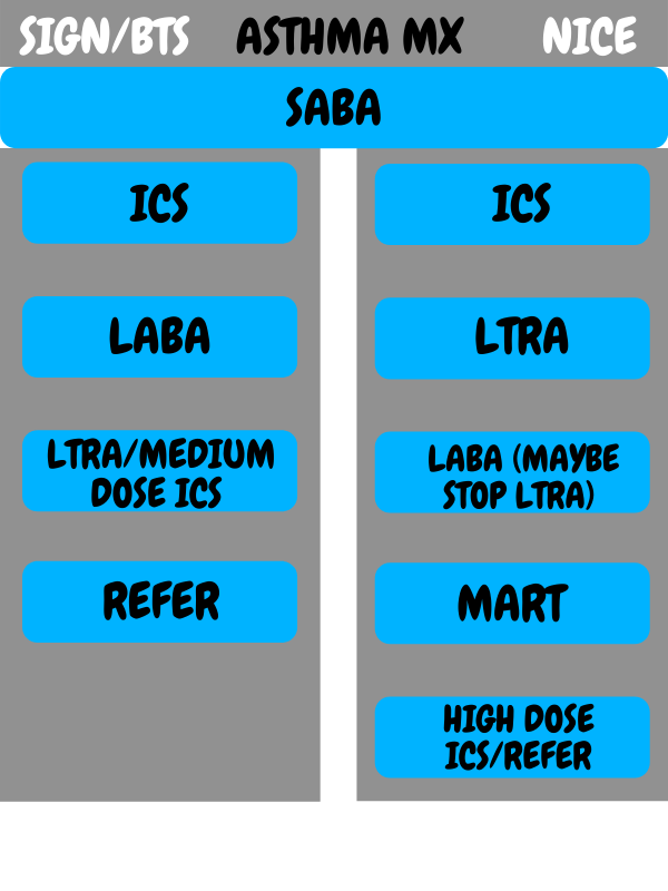 Several bodies have released guidelines on asthma management. The following information references the BTS and SIGN asthma guidelines (see below for NICE). Patients are started off on step 1 and moved up or down through the different treatment steps depending on how symptomatic they are despite treatment.